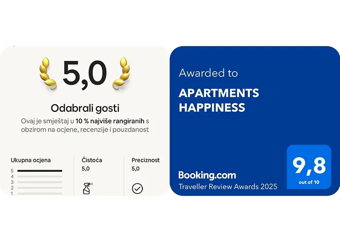With a sofa, Apartments Happiness offers a television, ironing facilities, and conveniences like climate control. Along with sea views, guests will also appreciate sound-proofed windows, which enhance the overall experience. Beds fitted with feather down pillows are at guests' disposal. A bathroom is equipped with a walk-in shower and a separate toilet, as well as a hair dryer and bath sheets.